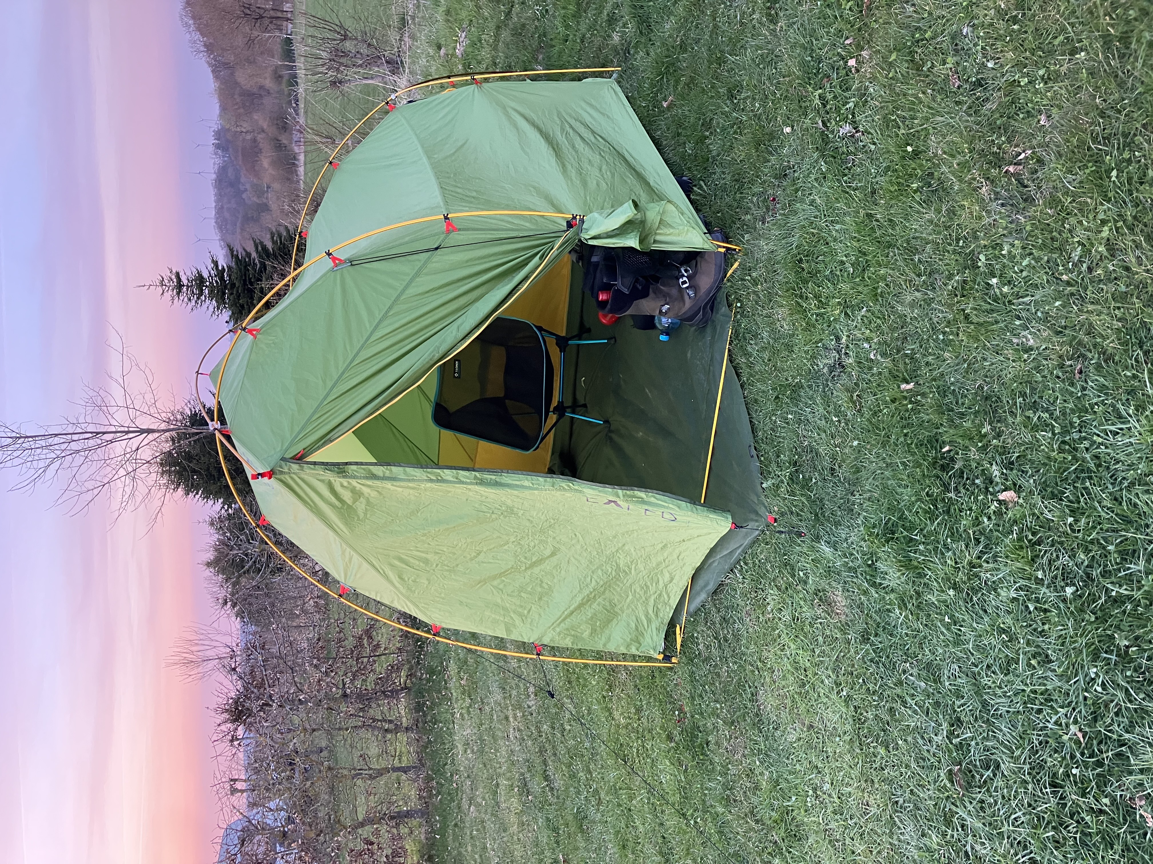 En zo blij dat ik de Exped tent heb meegenomen. Meer ruimte dan het tunneltje van vorig jaar, maar ook uit de wind kunnen zitten op een stoel in de voortent. Wat een luxe.