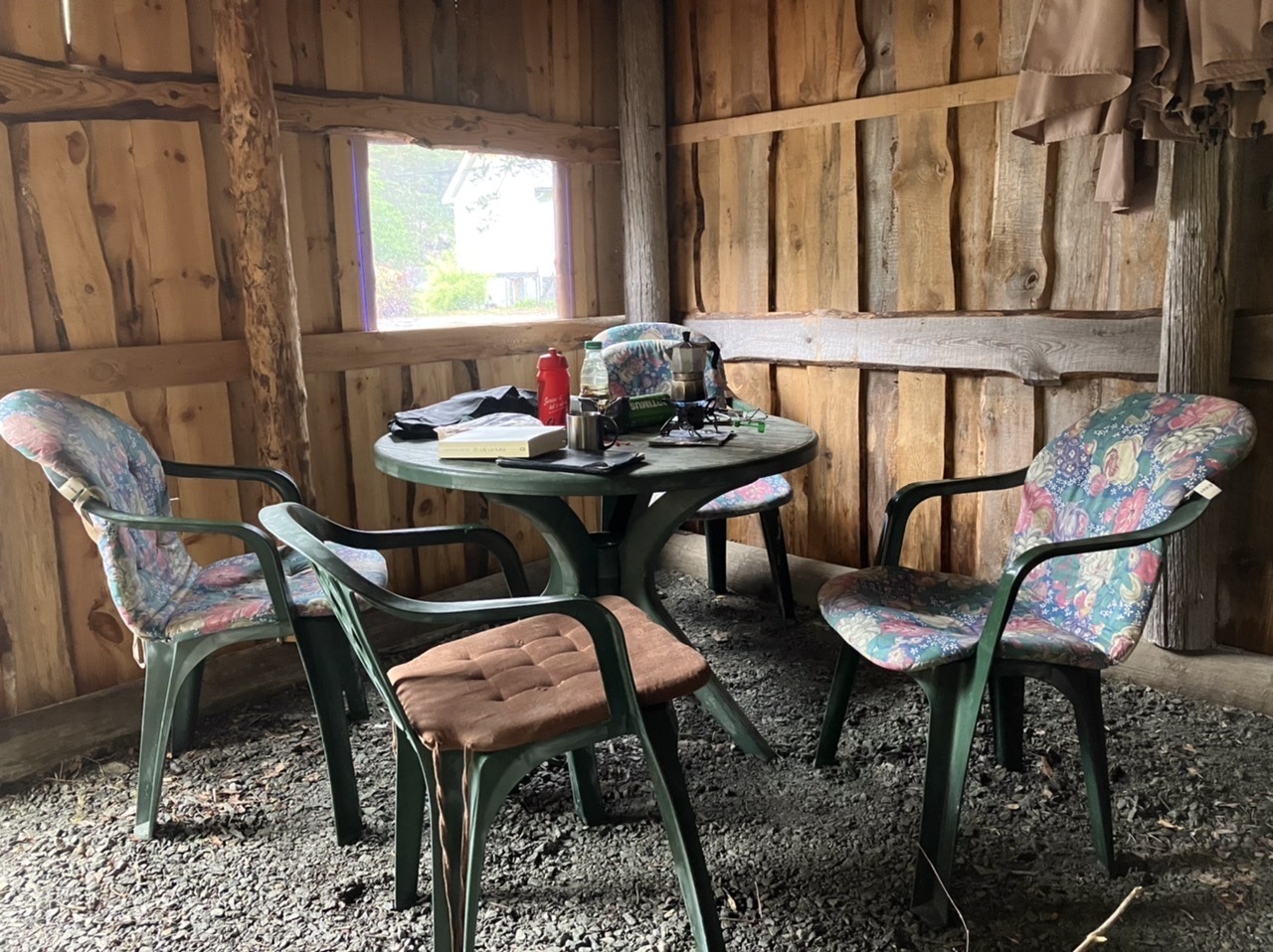 oals voorspeld een dag met regen, ik ben op tijd wakker, maar met regen en geen plannen voor deze dag blijf ik liggen. Dat hou je natuurlijk niet de hele dag vol en rond half tien ga ik richting douche. Onderweg krijg ik koffie aangeboden van de eigenaar en dat sla ik uiteraard niet af. Na 2 koppen koffie zijn we een uur verder en ga ik alsnog even douchen.
