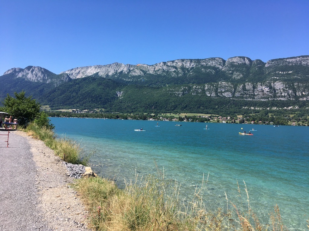Het is vroeg deze ochtend. Om 8 uur komt de bakker al toeterend het terrein oprijden. Handig natuurlijk dat je ontbijt gebracht wordt, alleen die klote herrie hoeft toch niet. Affijn de zon schijnt al over de berg heen, nu rustig opstarten met koffie en brood en dan de boel inpakken. Vervolgens rij ik richting Annecy.