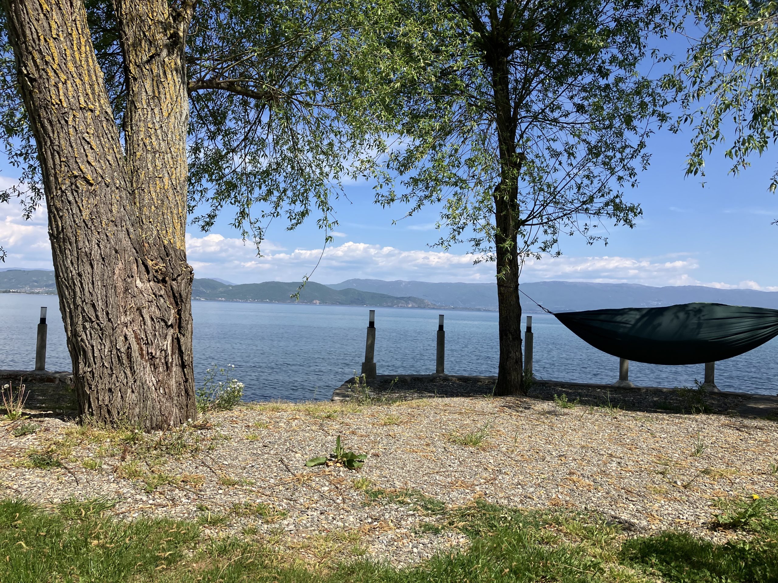 Nu op een heerlijk kampeerterrein aan het water. Morgen de omgeving een beetje verkennen, Ohrid bezoeken waar een oud Grieks theater is opgegraven. En ver zie ik wel. Albanië en Griekenland liggen hier om de hoek. Nog geen idee welke richting het maandag wordt.
