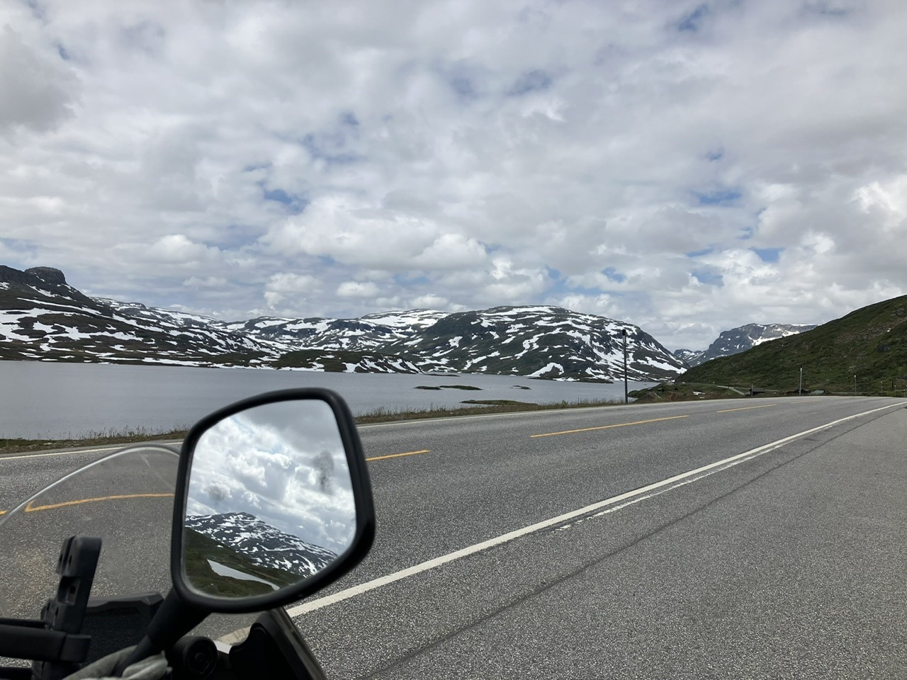Over de bergen heen daal ik weer af en wordt het weer wat warmer en ook de zon laat zich weer wat meer zien. Maakt het allemaal toch leuker natuurlijk. Net op tijd zie ik dat ik linksaf moet een nog smaller weggetje in, wel geasfalteerd dus gewoon gaan. Het blijkt later dat dit de oude weg is van Odda naar Stavanger, eind 19e eeuw aangelegd voor paard en wagen. Pas in de jaren 90 aangepast voor het moderne vervoer, maar nog steeds smal en weinig gebruikt omdat er verderop een brede nieuwe doorgaande weg is gekomen.