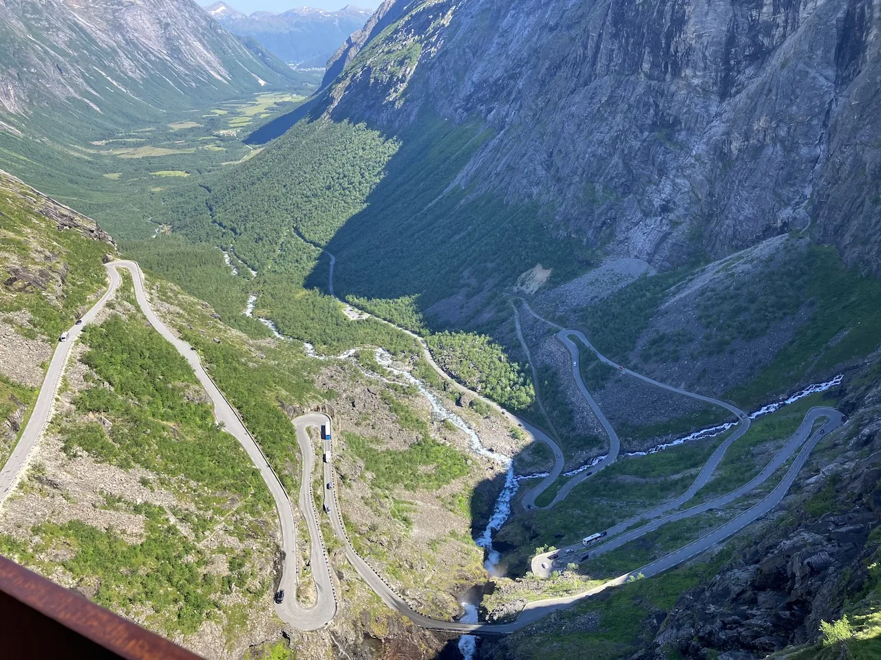 Bij Eidsdal pak ik de veerboot om het fjord over te steken en zo kom ik dichtbij de Trollstigen. Het is nog vroeg in de middag en ik heb alle tijd dus even lunchen en dan door de Trollstigen afdalen. Een behoorlijke afdaling met een lengte van 20 kilometer en 11 haarspeldbochten. Mooi om te rijden, gelukkig tref ik het en rijden er geen bussen voor me aan.